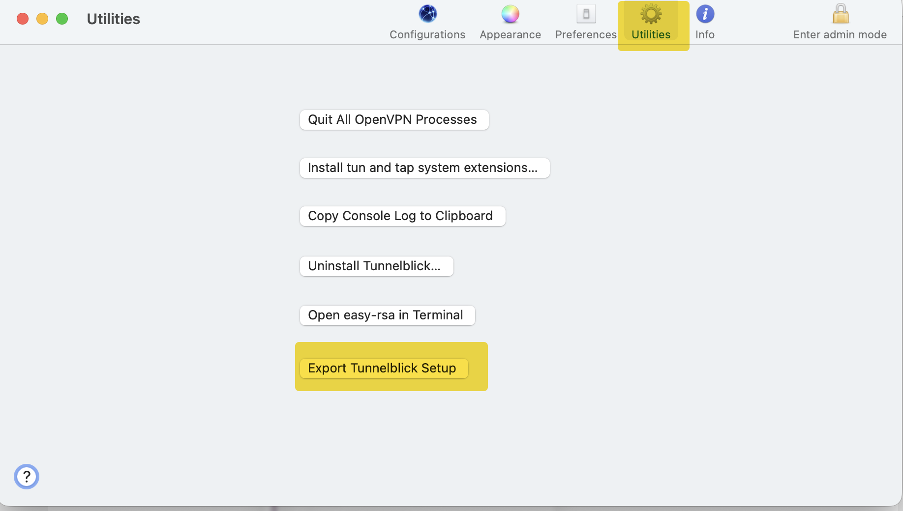 - Export the existing Crime VPN configuration file from Tunnelblick