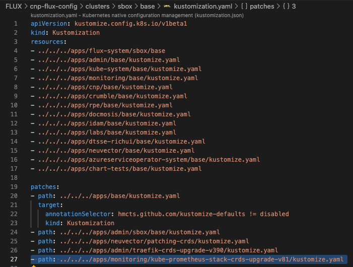 To use these files we can patch the desired cluster with this new directory in the base kustomization file e.g.: clusters/sbox/base/kustomization.yaml
